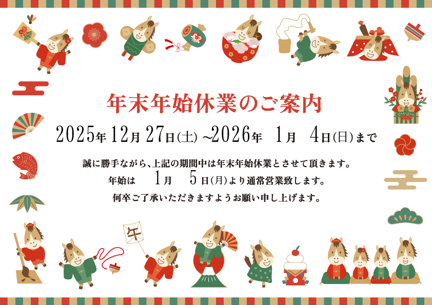 2025年商店街事務所 年末年始休業のお知らせ 2025年12月27日(土)から2026年1月4日(日)まで商店街事務所がお休みとなっております。 2026年1月5日(月)より営業となります。 どうぞよろしくお願いいたします。